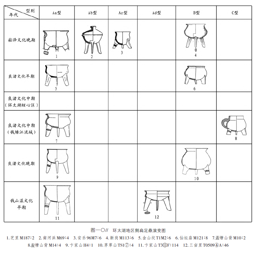 通过本文梳理可知,良渚文化晚期侧扁足鼎是环太湖地区新石器时代晚期本地特征明显的一种主流炊器(图一〇)。最早可追溯到崧泽文化晚期,良渚文化中期一度在环太湖核心区消失不见,后又在本地传承和钱塘江流域因素影响下重现并逐渐流行,最终取代良渚文化晚期的T形足鼎完成了质变,质变后的新遗存应该属于钱山漾文化早期遗存。