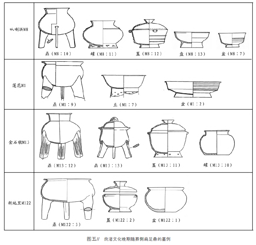 目前已发表的以侧扁足鼎作为随葬品的良渚文化晚期墓例仅有5座,分别为桐乡叭喇浜M8、桐乡新地里M122、海宁金石墩M13、海宁莲花M1和金山亭林M6(图五)。对照新地里分期标准,这些墓葬大致约当新地里第四至五段(亭林M6的年代不甚明确)。