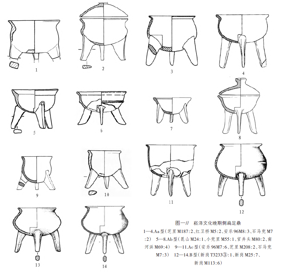 一条是对环太湖核心区自崧泽文化晚期和良渚文化早期就出现过的本地因素的继承。良渚文化晚期的Aa型鼎、B型鼎与崧泽文化晚期、良渚文化早期的同型器,无论是鼎身或鼎足的形态,都非常接近,说明它们之间应有一定渊源关系。但是,考虑到它们之间又存在良渚文化中期近二三百年的缺环,仅依据形制相近就断言它们之间有直接的继承发展关系难免武断,或可视之为复古现象,即一种特殊的继承形式。