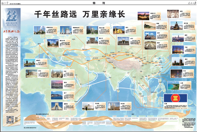 詹长法:在2016年9月举行的首届丝绸之路(敦煌)国际文化博览会上,展出了一幅明代手绘丝绸之路地图。这幅地图长30.12米,宽0.59米,描绘了从嘉峪关到天方(今沙特阿拉伯的麦加)的211个地点,涉及欧、亚、非三大洲的十多个国家和地区,是当时丝绸之路上频密广泛的文化和商贸往来的生动见证。