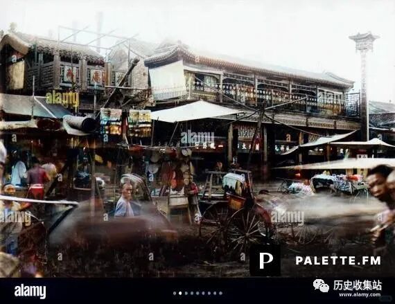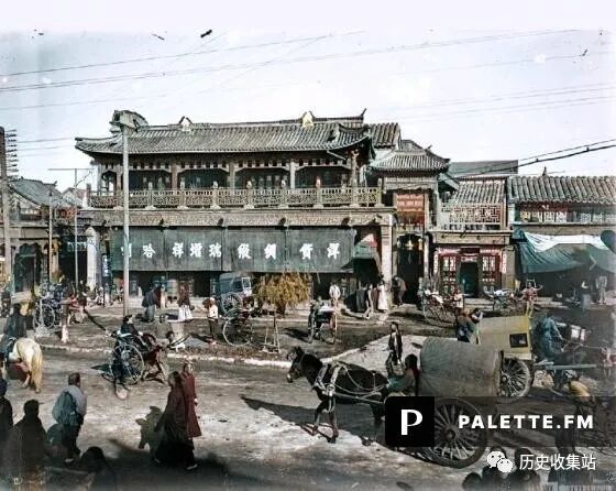 清末时期的前门大街一景展现出了热闹非凡的商业氛围。作为北京最著名的商业街之一,前门大街车马行人穿梭如织,各种贸易活动频繁,这里聚集了许多著名的商号和店铺。其中,瑞增祥绸布店就是其中之一,它作为著名的“八大祥”之一,以其精美的绸缎和布料而闻名于世。
