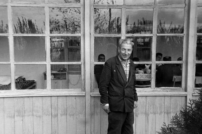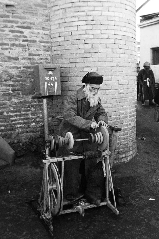 1969年,布哈拉公社街的一位老人,好像是在磨刀。