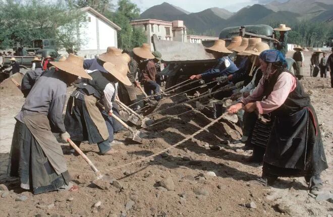 1979年,西藏的修路工人。当年机械化设备还很少,多是手工劳作。