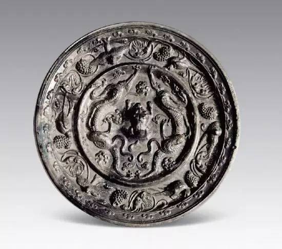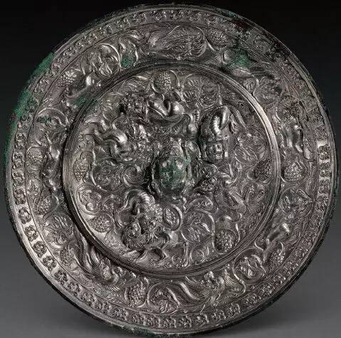 关于兽与葡萄的组合,应该起源于古希腊的酒神崇拜,在早期的酒神崇拜中,葡萄纹作为伴随纹出现在艺术作品中,后来不断发展,逐渐形成规则的图案,而且在葡萄间穿插禽鸟、动物和人类,这种组合仍然含有很大的表意功能,人们想表现的是大自然的和谐优美,同时也使画面显得活泼生动,随着人类文明的进步,这一图案的装饰审美作用日益为人们所重视,逐渐脱离了酒神的范畴,成为一种装饰图案。这种纹样传到中国后,与中国传统的瑞兽纹相组合,被装饰于铜镜上,形成一种在众人看来非常奇怪的组合。而二者的组合只在唐代出现在铜镜上。