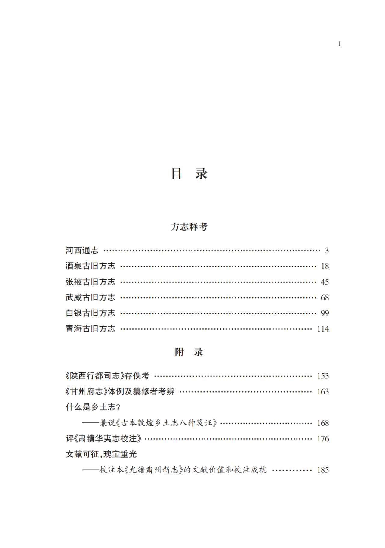 第一,辑录信息系统全面,将河西地区(黄河以西甘青地区包括湟水流域)目前所知的所有方志尽数收入,一网打尽,并逐一介绍点评。全书分“河西通志”“酒泉古旧方志”“张掖古旧方志”“武威古旧方志”“白银古旧方志”“青海古旧方志”6个部分,是目前搜集整理研究河西古旧方志数量最多、种类最全的专著,也是将河西古旧方志整理的最彻底的历史文献。