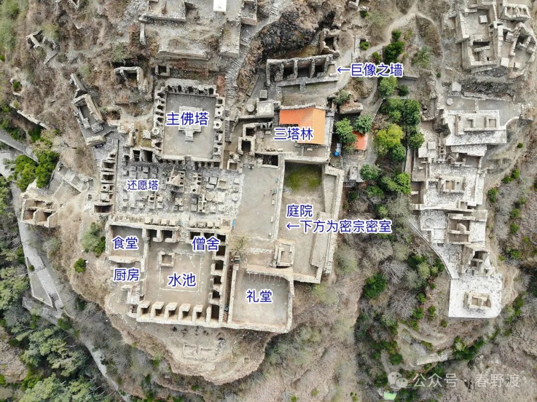 俯视图的左下角中间一个水池、四周围着一格又一格的小房间的,是僧侣们住宿、学习的僧舍,这个四方形的一角则是厨房和食堂。