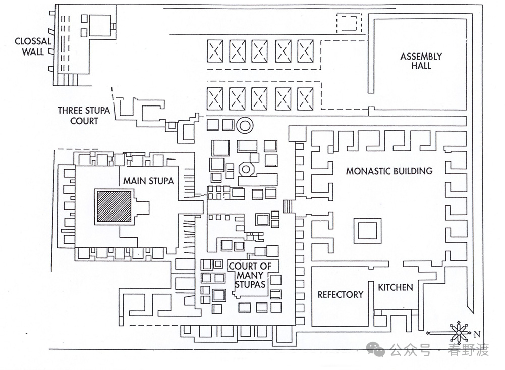 其实看多了会发现,巴基斯坦的古寺格局大多有相似之处,比如这张俯视图的左上方,中间有个四方形佛塔基座的,就是这座寺庙主佛塔所在地。四周围了一圈的小房间,之前里面应该都是供着佛像的。