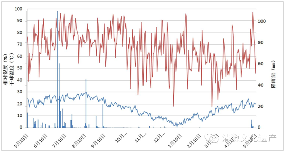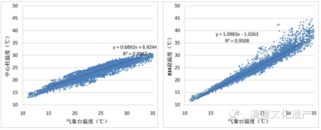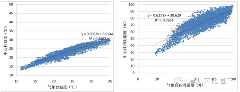 可以看出,即使在千佛崖进深最大的窟龛里,窟内外温湿度间的关系也几近完全的线性。也就是说,窟内的环境变化基本就是窟外环境变化造成的,游人在其中的作用难以与外界环境相比拟。