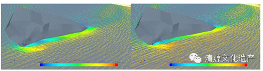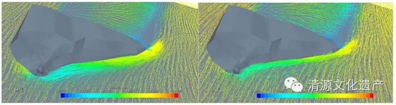 上图为保护设施的初期设计中,我们对北风情况下有无保护设施时窟龛区域风环境进行的模拟结果。