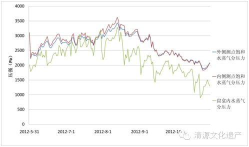 监测还给出了窟龛内凝结情况的估算。根据湿空气热质交换相关理论,空气的水蒸气分压力高于或等于壁面温度所对应的饱和水蒸气分压力是凝结的必要条件。故该洞窟内外两侧可能出现凝结时间基本集中于7、8月份,而其余时间出现凝结的可能性较小。