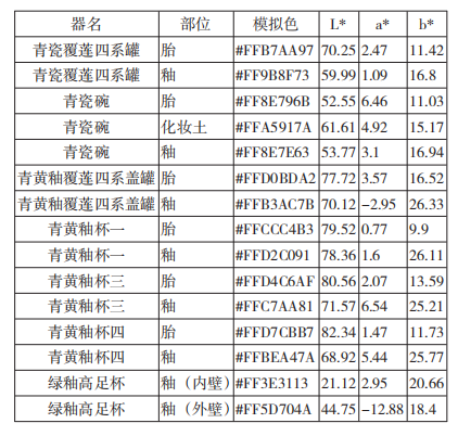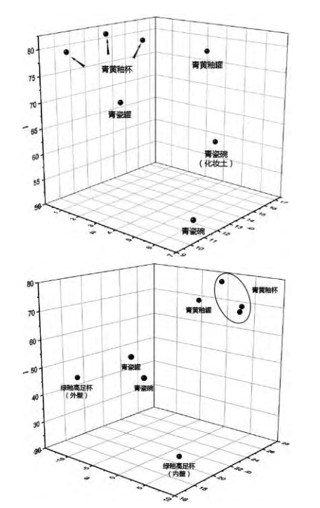 化学组成结果显示,助熔剂方面,覆莲纹罐、碗釉中为K、Ca,属高温青釉瓷器;覆莲纹盖罐、杯、高足杯釉中为Pb,属低温铅釉陶器。致色剂方面,覆莲纹盖罐、杯釉中为Fe,高足杯内壁棕釉为Fe,外壁绿釉为Cu。在CIE1976L*a*b*空间中,L*为心理计量明度,表示颜色的亮度高低。a*表示红绿轴的变化,a*为正值时,颜色为红色;a*为负值时,颜色为绿色。b*表示黄蓝轴的变化,b*为正值时,颜色为黄色,b*为负值时,颜色为蓝色[3]。色度测试数据分析如图二所示,施釉器物的胎体均泛黄[b*∈(9.9,16.52)],但青瓷碗明度最低,即胎体呈色深,因此采用了化妆土工艺,起到掩盖深色胎体、提升釉面亮度的作用。釉色方面,绿釉高足杯内壁为棕釉,其亮度最低。外壁为绿釉,表现为a*值最低。青黄釉器物与两件青瓷器物相比,其亮度高、b*值大,在外观上给人以偏黄的效果。综合色度与化学组成检测,可将墓葬中出土器物定名为:青瓷覆莲纹罐、青瓷碗;青黄釉覆莲纹盖罐、青黄釉杯、绿釉高足杯。本次检测结果,为今后讨论北朝墓葬出土青瓷与铅釉陶器物,提供了科学数据。图二 样品胎体与釉色的L*a*b*空间坐标