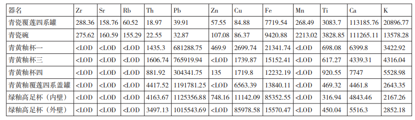 为判断19件器物的类别,利用色度仪与便携XRF,对器物进行无损检测,以获取器物的色度、化学组成等综合参数。仪器参数:色度仪采用3nH公司的YS3010型光度仪,测了直径为8mm,测定样品的L*、a*、b*值,分析结果见表1。便携XRF,为美国赛默费舍尔公司生产的NITONXL3t型便携式XRF,使用内建于该设备的土壤模式,对样品的胎釉进行了测试,分析结果见表2。