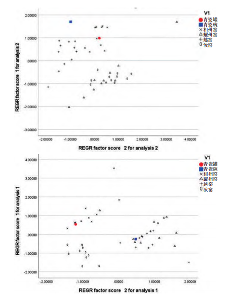为判断这两件青瓷器物的产地,挑选10件相州窑青瓷片进行化学组成分析,同时辑录越窑、汝窑、耀州窑的化学组成数据[11],以期通过比较来确证李亨墓出土两件青瓷器物的来源。使用社会统计软件SPSS27.0对分析结果进行多元统计分析,分别选取K、Ca、Ti、Mn、Fe五种含量较高的元素及Cu、Zn、Rb、Sr、Zr五种含量较低的元素进行因子分析。分析结果显示(图三),第一,各个窑址釉层的元素含量差别显著,这说明使用便携XRF进行瓷器产地的无损分析是可行的。第二,墓葬出土青瓷覆莲纹罐落在相州窑的数据分布范围,可以推断该件器物应属于相州窑的产品。第三,墓葬出土青瓷碗,在常量元素方面,游离在4处窑址之外,其产地分析有待后续窑址数据库的扩充。四 结语