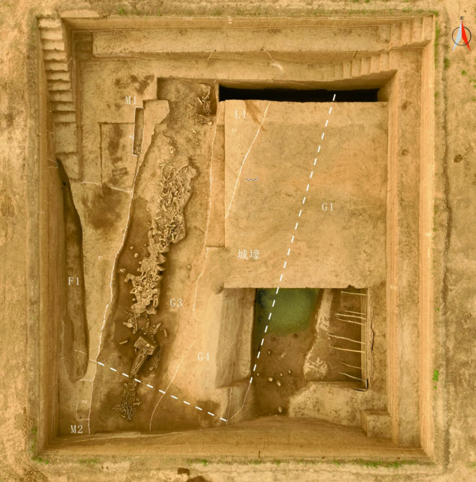 河南省安阳市殷都区洹北商城遗址位于河南省安阳市殷都区,安阳市西北部。洹北商城遗址郭城东南角,位于安阳市西北部,安阳航空运动学校内。2023年4~10月,中国社会科学院考古研究所安阳工作队对洹北商城郭城东南角进行试掘,获得洹北商城郭城的“城墙基槽”应为城壕的重要证据,并发现了殷墟三期大型祭祀沟遗存。东南角城壕被后期的G1、G3、G4打破,城壕的东部在G1之下尚有一点残存。此外,G3打破L2及城壕。L2开口于L1下,为一条叠压于城壕之上,并与城壕走向一致的道路。L2的形成时间大致为洹北商城城壕废弃的年代至殷墟三期之间,这一地层关系为判断洹北商城城壕的性质提供了佐证。祭祀沟,编号G3,被道路L1叠压,打破G4与城壕。根据钻探,仍有向南、北延伸的趋势。根据地层关系、陶器及碳14测年综合判断,G3年代为殷墟三期。祭祀沟内堆积可分为3层,3层堆积呈水平状,3层内放置有完整人骨和肢解人骨、马骨、猪骨、牛骨等,其中部分骨骼或周边有烧过的痕迹。整体趋势呈完整人骨-肢解马骨、牛头、猪骨-完整人骨-肢解马骨等的一个分布态势,根据分布态势大体可划分为五区。此次发掘为洹北商城的“城墙基槽”应为“城壕”的推测提供了重要证据。此外,发掘的G3祭祀遗存的形式、种类、规模、数量与祭祀方式皆为此前殷墟发掘所未见,丰富了殷墟时期的祭祀方式,也为理解洹北—殷墟城市布局的发展、演变提供了新资料。
