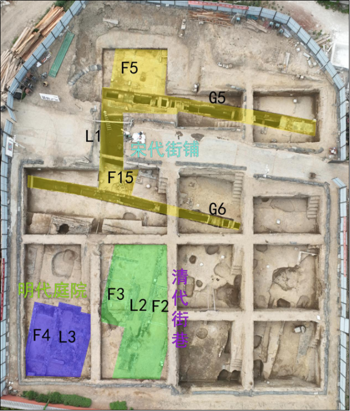 河南省邓州市邓州古城遗址位于团结路宋金古街遗址中西部,为一期发掘区东扩部分。2022年7月~2023年8月,河南省文物考古研究院联合邓州市文化广电和旅游局对遗址进行发掘,发掘面积1500平方米。宋代街铺,由L1和两侧分布的G5、G6及临街商铺构成。L1作为城市东西商业大街一直在使用,古城街巷肌理从唐代沿用至今。F5内北侧灶附近见有大量铜钱,疑与经商活动有关。明代庭院,即L3。两边用竖砖砌成。L3整体布局、建造技艺具有典型的南方造园艺术特色。清代街巷,由F2、L2、F3和L1联合组成的街巷。F2、F3分别位于L2东、西两侧。F3四开间,墙体为夹墙结构。此外,通过探沟解剖和布设探方还发掘了邓州古城遗址迎旭门城墙遗迹。结合地层、遗迹打破关系和出土遗物推断城墙年代下限为宋代。出土遗物数量多,种类丰富,以瓷器为主。日常用品以瓷碗、盘类是为大宗,常见釉色有白釉、影青、黑釉、酱釉、青花和孔雀蓝等,装饰技法常见有刻、划、模印。可辨窑系(口)有耀州窑、邓窑、钧窑、当阳峪窑、定窑、磁州窑和景德镇湖田窑等。该遗址的发掘揭示了一个城市的格局风貌及从隋唐到宋金元明清的格局变化,印证了唐、宋、金、元时期邓州重要的的历史地位和灿烂的物质文明,出土的遗迹和遗物还体现了邓州是宋金时期重要的工商业城市。此外,还揭露除宋代街道外明清寺院禅房遗址,揭示了从龙兴寺到福胜寺的寺院历史格局变化线索。而且,迎旭门古城墙的考古发现印证了文献中有关邓州古城创修的记载,为下一步寻找邓州古城早期城墙遗迹和研究古今重叠型城市发展演变提供了重要线索。
