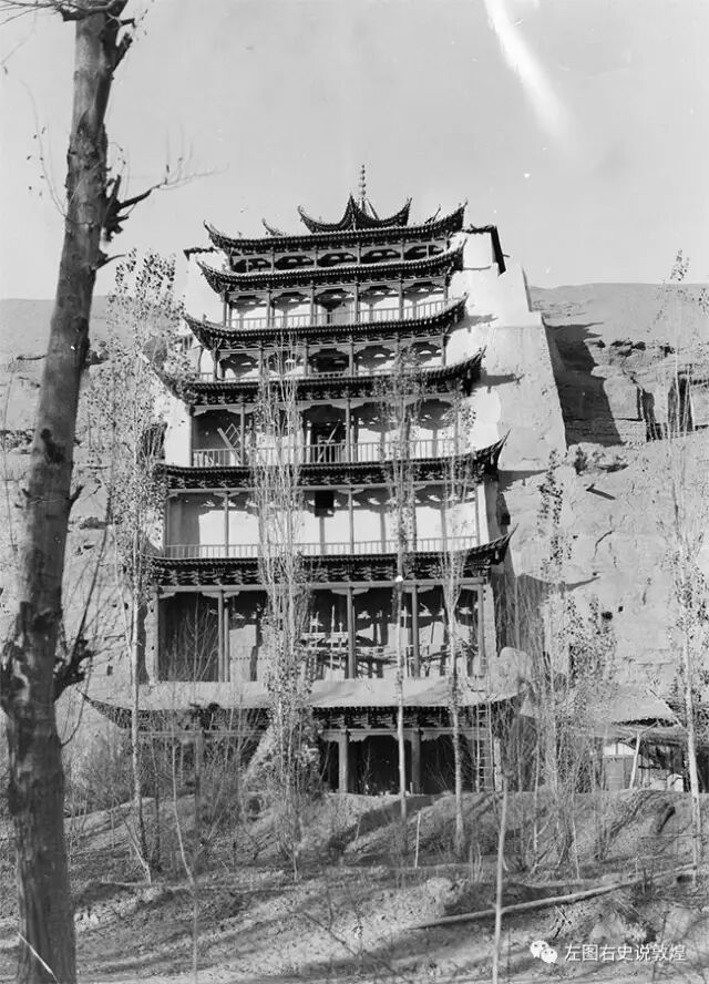 斯文•赫定一行于1934年11月5日上午拍摄的这幅莫高窟九层楼的照片很有价值,它是目前所见1927年起新建的九层楼的第一张照片。照片中的九层楼尚未竣工,第二层的架手架还未拆除。