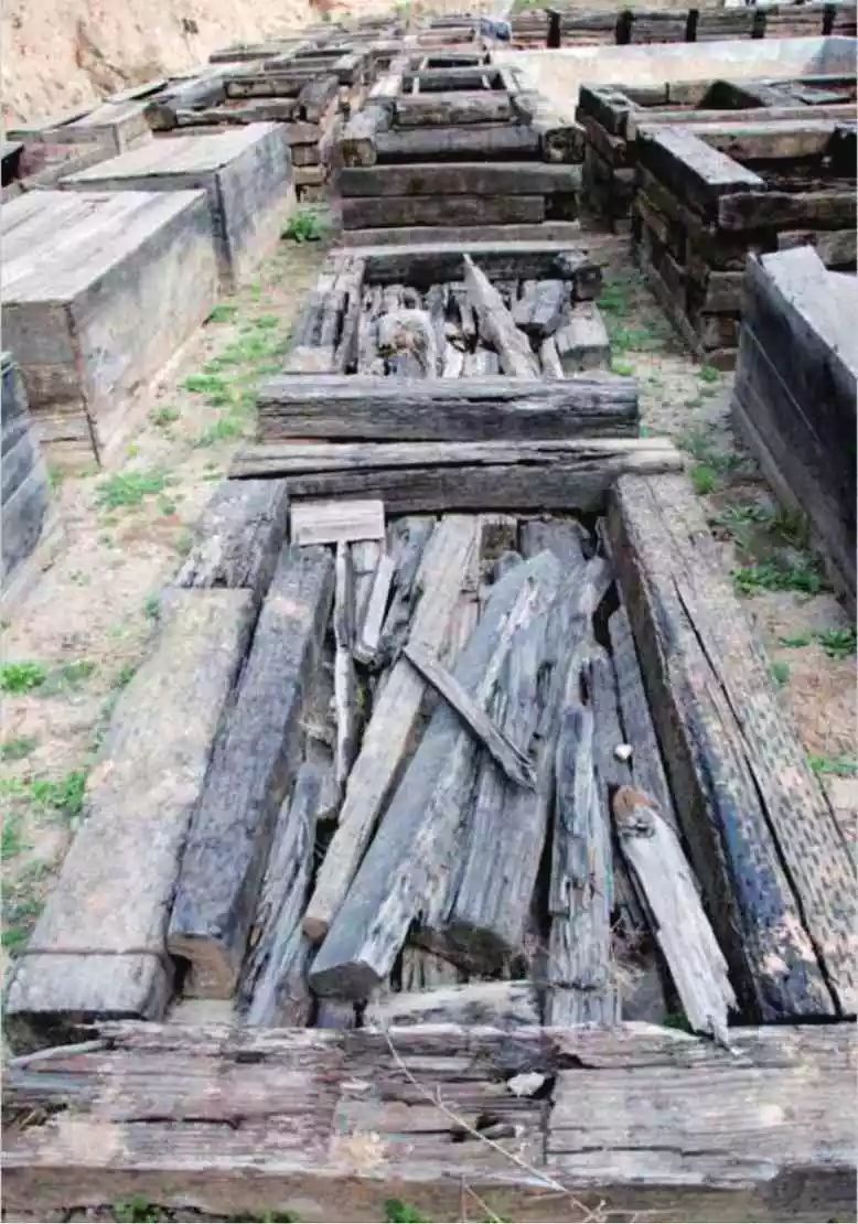 在这个神秘的巨墓中,充满了各种谜团,在大墓第3层台基的南北两侧,还各有一根直径40 cm、长2 m的木碑,其在泥土外的一端端顶还有一个直径15 cm的空洞,而且空洞显然是人为开凿出来的。这样的木碑在此前的挖掘中从未见过,这两根木碑的摆放位置与整个大墓的格局显得格格不入,显然不是出于美观的设计,它们究竟是起什么样的作用?经过研究发现,在举行盛大的埋葬仪式时,木碑起到了轱辘滑轮的作用,四根绋绳分别缠绕在两根木碑上,将大型的棺木捆绑在四根绋绳的中央,参与下葬的人手执着绋绳,然后击鼓为号使棺木徐徐落入坑中。