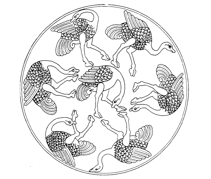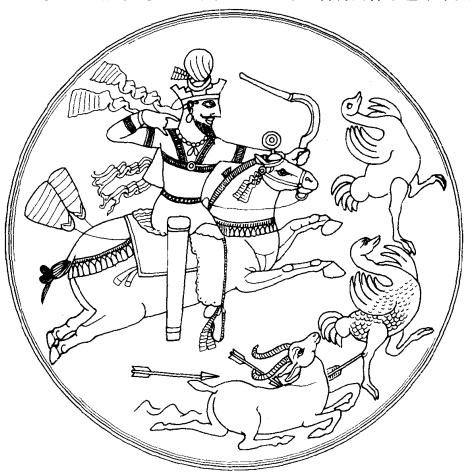 采自孙机所引[日]田边胜美《バフラ‐ムグ‐ル狩猎图金象嵌银制皿に关するー考察》相关图片,孙机《七鸵纹银盘与飞廉纹银盘》,载氏著《中国圣火:中国古文物与东西文化交流中的若干问题》,第161页