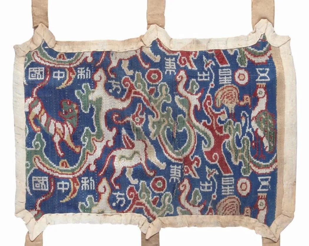 鸵鸟在艺术领域的另一应用是作为纺织图案,主要见于“五星出东方利中国”织锦护臂。1995年中日共同尼雅遗址学术考察队发掘尼雅遗址95MN1号墓地,在M8中出土一件汉代“五星出东方利中国”织锦护臂(见图4)。其上出现了疑似鸵鸟的图案,但调查报告称其上“织出星纹、云纹及孔雀、仙鹤、辟邪、虎等瑞禽兽纹样”。众多学者对锦上图案做出了辨析。参与发掘的于志勇认为锦上“有虎、龙、辟邪、仙鹤、孔雀、瑞兽图案”。孙机认为图案为虎、辟邪、大鸟、灵禽,但未明言“大鸟”是何种鸟。李零指出“这件‘护膊’虽然是精绝古墓中的随葬物,但材料却是汉地所出,实际是用汉地的织锦裁制。它上面的文字反映的乃是汉地的思想,而不是精绝国的思想。”并认为织锦图案有鸵鸟纹。林梅村亦持此见。笔者也赞同李零先生的观点,即这块汉代织锦上有鸵鸟图案。除了其具体形象相似外,我们稍作考察也不难发现,织锦上所呈现的虎、辟邪、孔雀等“瑞兽”皆有异域动物的源流,这块织锦出土于精绝古墓中则表现了墓主人对于其绘图案的接受,而彼时新疆地区作为中西交通的必经之路,其人对于这些域外动物的认识是早于且深于中原汉地的。这虽然没有汉以前的实物和文献支持,但是在去汉未远的南北朝时期可以得到证实。1990年焉耆县出土一件南北朝时期的七鸵纹银盘(见图5),其鸵鸟纹样生动逼真程度远超汉代织锦,且该器物已是作为生活用具而存在。那么综上,“五星出东方利中国”织锦上出现与孔雀等同为域外动物的鸵鸟纹样是合情合理的,“大鸟”纹样就是鸵鸟纹。