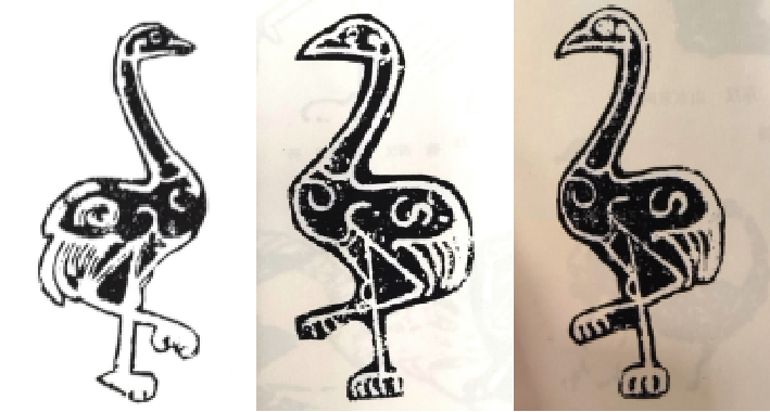 至于汉画中鹤与鸵鸟的辨识,则多有辨别错误的情况,尤其是错将鸵鸟识别为鹤。按郭义恭《广志》云“蹄似橐驼”,橐驼即今所谓骆驼,实际上已经指出了辨识鸵鸟的重要依据。现代鸵鸟为驼形目鸵鸟科鸵鸟属且足具两趾,较发达的一趾几近于蹄。骆驼为偶蹄目,今山东地区多出土东汉驼纹画像石,时人对于骆驼的认知是相当明细的,可见《广志》所言不虚,鸵鸟蹄确似骆驼,为两趾,上引七鸵纹银盘中的鸵鸟纹则证实了这种认识。汉画中鸵鸟汉画像砖被误识为鹤的情况,笔者在此以三例加以讨论,其中两种为河南洛阳出土西汉画像砖(见图6),另一种为河南郑州所出汉画像砖(见图7)。图6所示两种汉画中的鸟类均为两趾,且趾部肉厚而饱满,显然具备鸵鸟的趾部特征。而同为河南洛阳所出的其他“鹤”纹画像砖则有着明显不同于该二种的趾部特点(见图8),从拓片可见此三种画像中鸟类均为四趾且四趾细长,正是“鹤”。图7为一鸟类进食汉画,画像中的鸟类为两趾、短喙,整体造型与同类“鹤”纹画像砖中四趾、喙长而直的鹤有着较大的区别,且汉画鹤进食图像大多突出其喙强直、细长的特点(见图9)。相反,其外形与上文所述“七鸵纹银盘”中的鸵鸟却十分相似,同时,画像中鸟类身体向上拱起,向下伸脖作进食状的姿态与“五星出东方利中国”织锦鸵鸟图案有异曲同工之妙,故该画像砖中的鸟类是鸵鸟的可能性较大。综合上述可知,此三例汉画均是被误识为“鹤”的“鸵鸟”,而这种案例的数量应当不止于此。