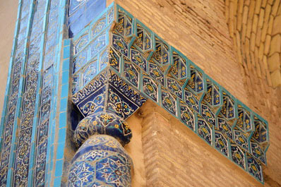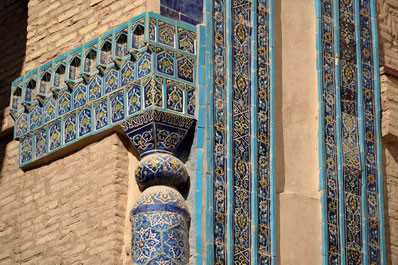 Over centuries, the complex was expanded and renovated, reflecting architectural styles from various eras. The ensemble reached its final form in the 17th century, marked by the last burials and completed decorative work. Its entrance portal, adorned with multicolored majolica, is a striking feature. The intricate brickwork decorating the walls, ceilings, and vaults of the tombs creates a lasting impression. Inside the domes, the intricate arrangement of bricks in spiral patterns symbolizes the connection between the earthly and divine, material and spiritual.