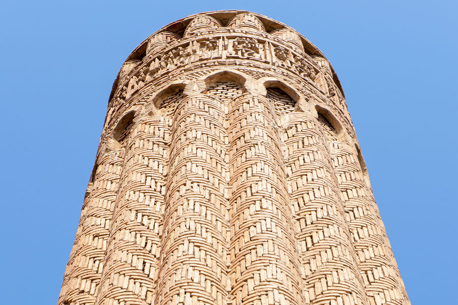 The most striking feature of the Jarkurgan Minaret is its sculpted facade of 16 vertical half-columns rising from an octagonal base. Each rounded shaft is built of elongated burnt bricks laid in a herringbone pattern, creating a distinctive zigzag design. The recessed half-columns and the method of clay block masonry not only produce a powerful visual effect but also enhance the strength and stability of the structure. This technique was widely used in medieval Khorezm, but it reached exceptional refinement in Jarkurgan.
