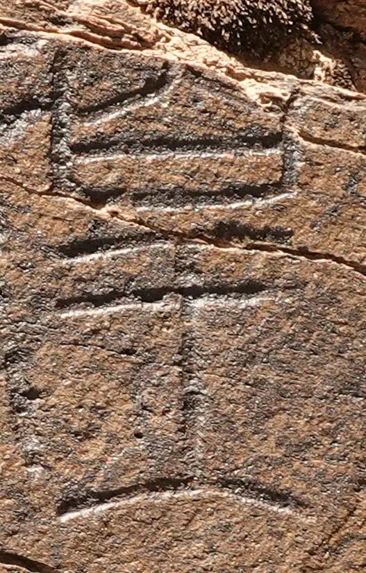 □ □下方岩面脱落,仅存一道短竖划,上端有脱落。平凿,边缘较齐整,底部有顿挫痕,不甚平。结合上下文,此字为“十”应无问题。