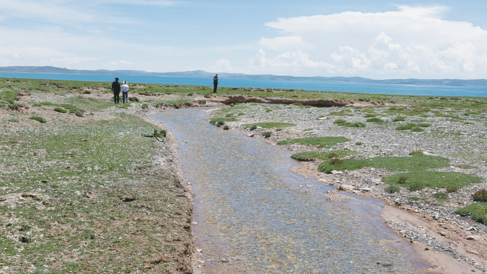 此地处于扎陵湖北岸缓坡地带,湖滨平坦开阔,牧草覆盖不完整,多有沙砾裸露,有草场退化现象。从玛多县城通往黄河源的沙石公路从坡下东西通过。东侧约500米、西侧约1000米各有一条小河由北向南流入扎陵湖,西侧小河调查时河面宽2—3米左右,河水清澈,是良好的饮用水源(图3)。附近地势平缓,牧草遍野,适合搭建帐篷歇息,此处地名“尕日塘”,藏语意为“往来歇息之平地”,看来古今相通。