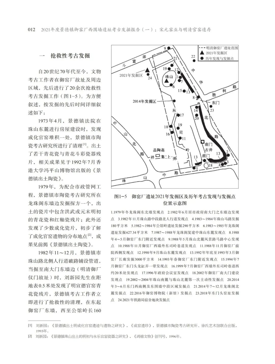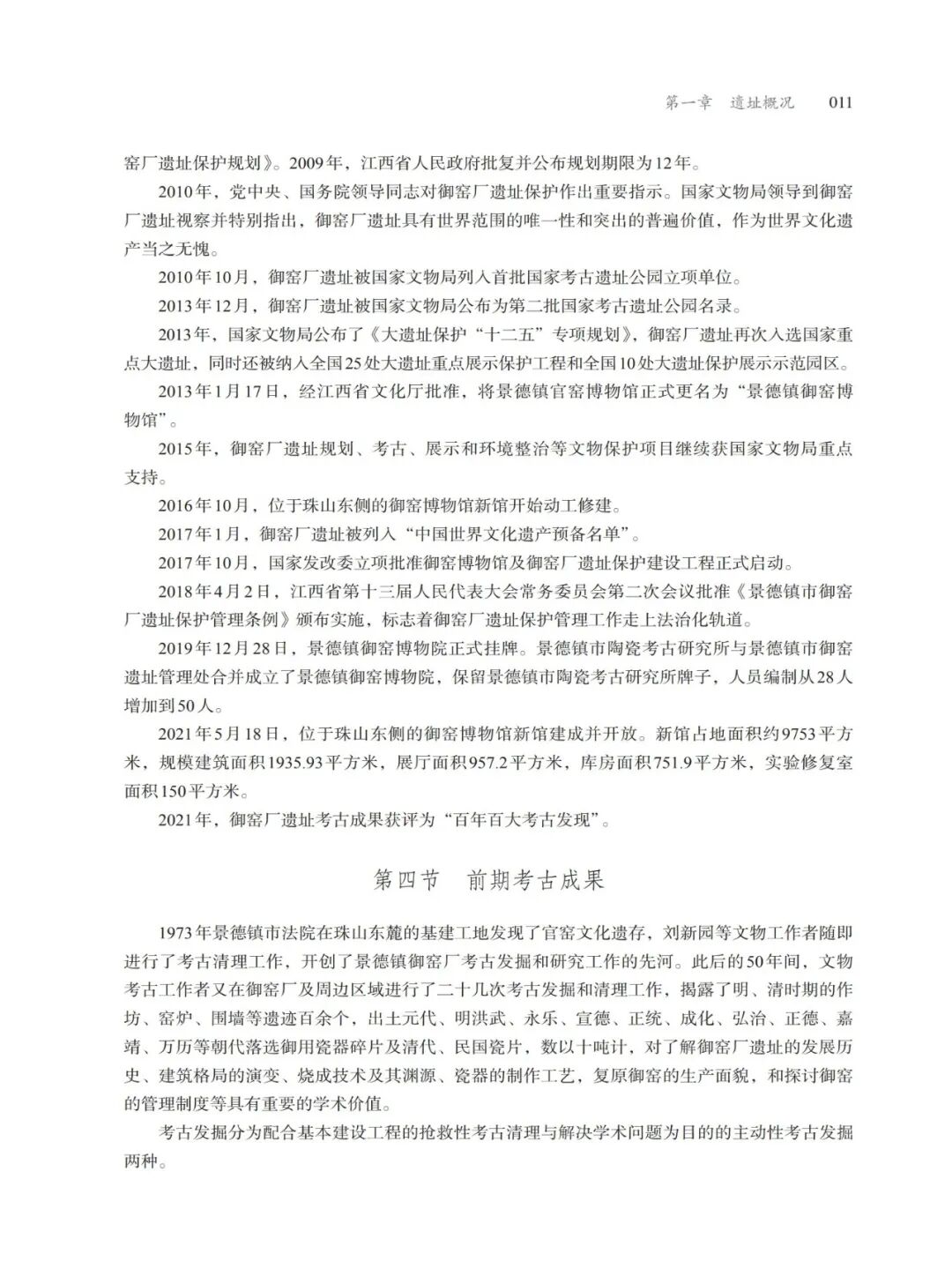 自1973年以刘新园为首的景德镇市文物工作者在珠山东麓的市法院基建工地发现官窑文化遗存以来,在过去多年中,各方考古机构,对御窑厂遗址进行了多达几十次的考古发掘、清理,揭露了明、清 时期的作坊、窑炉、围墙等遗迹百余个,出土元、明洪武、永乐、宣德、正统、成化、弘治、正 德、嘉靖、万历等朝的落选御用瓷器碎片及清、民国瓷片,数以十吨计。本书回顾历年御窑厂遗址的调查、试掘、发掘成果,对文献做了基本的梳理。