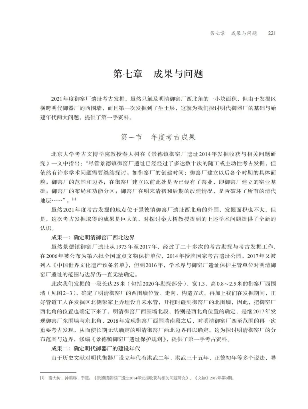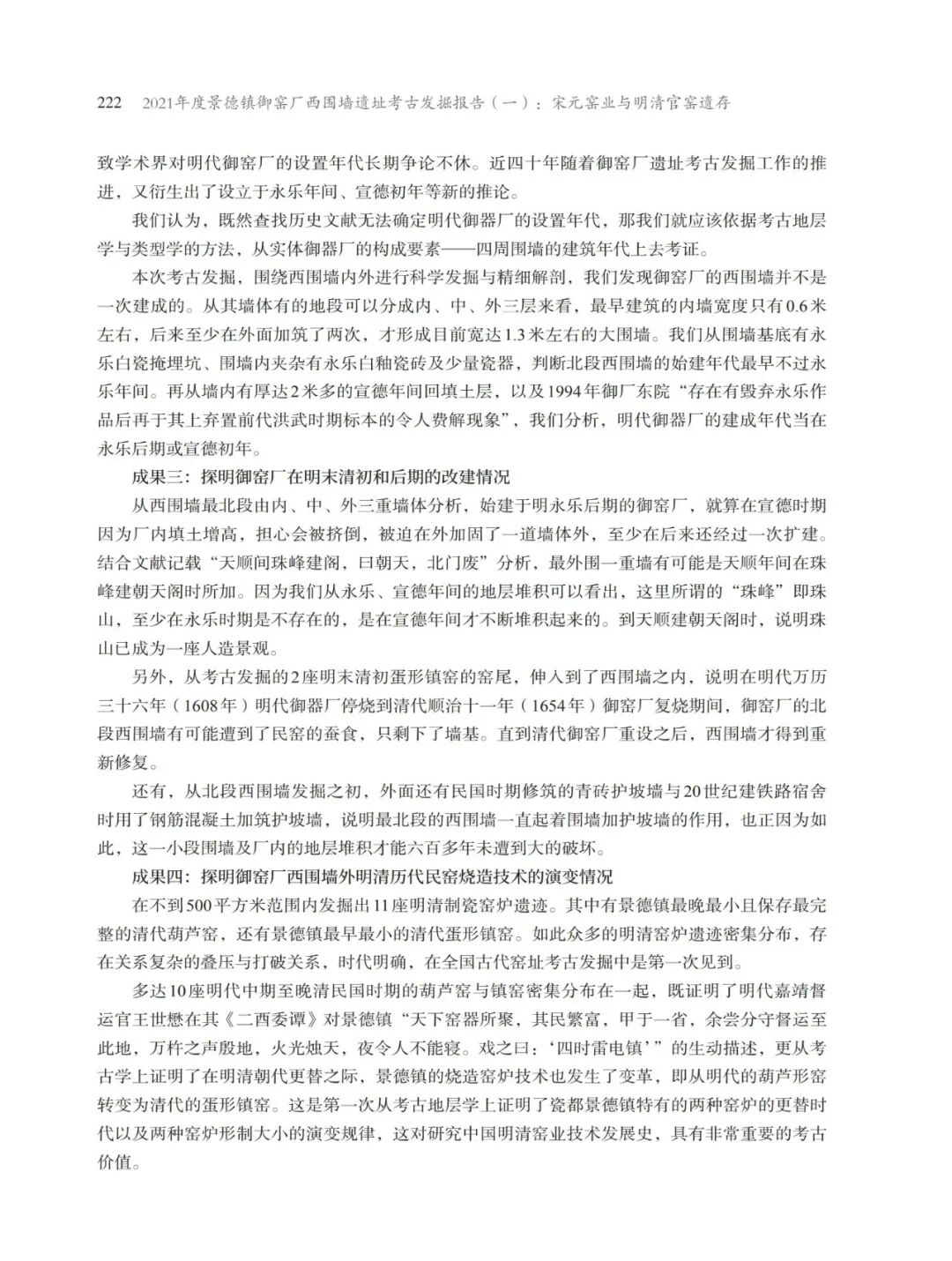 对御窑厂遗址进行考古发掘已有50余年,学界期待一本正式的御窑厂遗址相关的考古发掘报告已久,本书的出版,不但完成了系统、全面、准确、客观地公布田野考古工作所获资料这一使命,在此基础上还提供了一定深度和广度的研究和思考。本报告不但详细介绍了御窑厂遗址的自然环境和历史背景、过去考古工作的主要成果、本次发掘的缘起和预期目标、发掘队的组成和发掘经过、文化堆积和地层关系、发现遗迹和出土遗物,而且还对明清御窑厂遗址过去的学术研究成果进行了系统总结,根据2021年度考古发掘所获最新资料,结合历史文献,对相关学术问题进行了梳理与研究,提出了很多新认识。