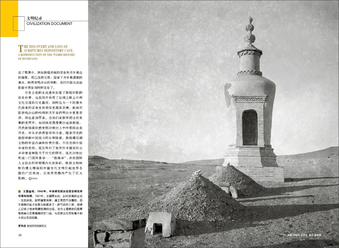 史学大师陈寅恪先生因此而慨叹:“敦煌者,吾国学术之伤心史也!”道士王圆箓不经意间承担起发现者与破坏者的双重历史角色,从而形成了一个小人物与大历史之间的微妙张力,他的墓塔今天仍孤零零地耸立在敦煌莫高窟的正门前,与这座文化宝库毫不相干却又无法回避。