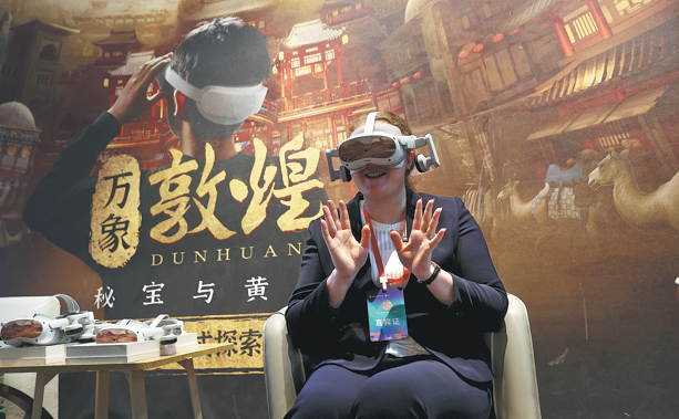 Russian scholar Olga Pronkina wears a virtual reality headset to have immersive historical experience at the Dunhuang Museum on Sunday. CHEN ZEBING/CHINA DAILY