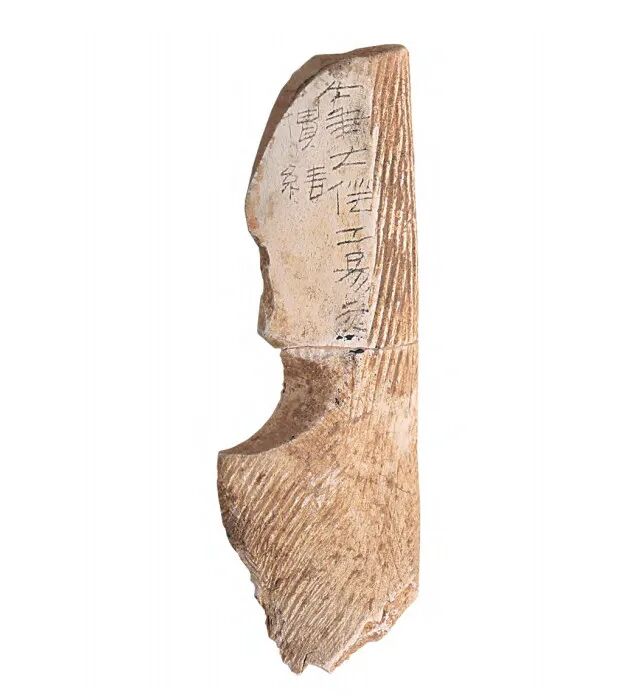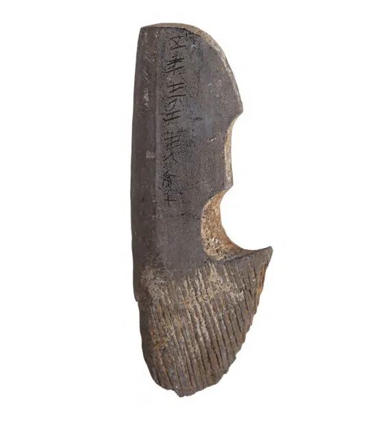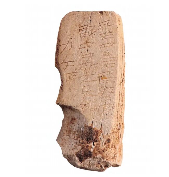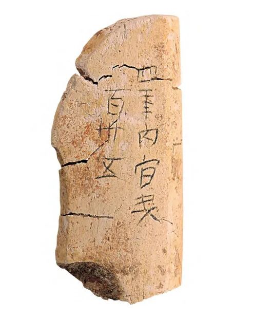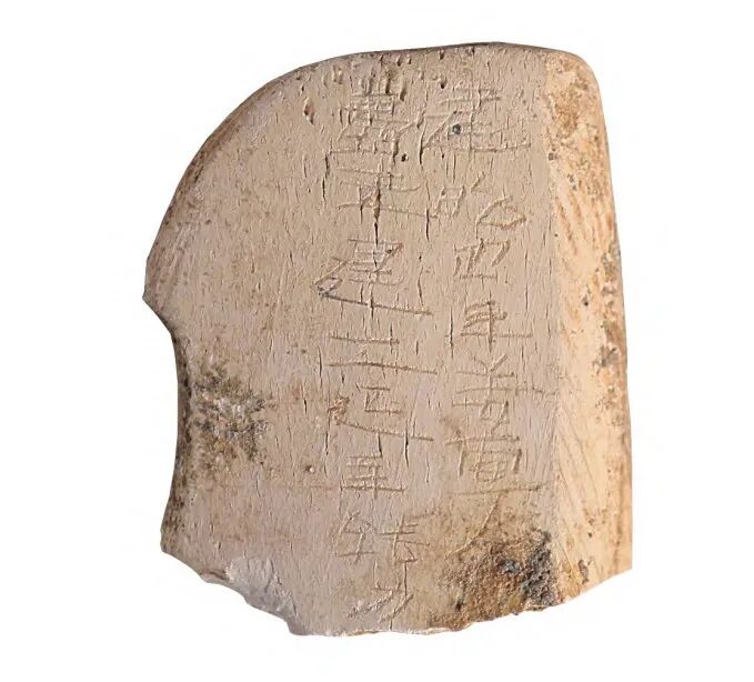 骨签主要用牛骨制成,以灰白色为主,形制比较统一,长条扁状,前端较圆,尾端略尖,中部有一月形凹槽(分左凹槽与右凹槽两种)。完整骨签长5~7、宽2~3、厚0.2~0.4厘米,在骨签正面的上部磨出一平面,其上刻出文字。文字多从上到下、从右至左刻写,字数少者2~3字,多者30~40字。