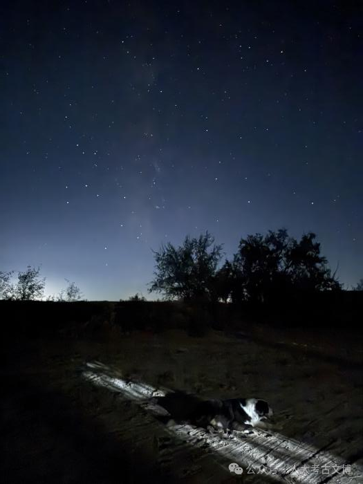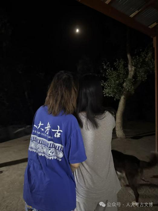 除了在沙漠考古中相互支持、在简朴生活里彼此照料,师生们还在异国他乡的夜空下,共同拥有了一段难忘的“观星记忆”—— 一场月全食的悄然降临,为他们的田野之旅添上了浪漫而厚重的一笔。历史学院学生孙雅卓回忆道:“我们住在沙漠旁,夜晚的时候,向前看是一望无垠的沙海,抬头便能看见灿烂的银河。队里的所有人在接近凌晨时披衣起身。不知是谁先惊讶了一声,我一抬头,便看见那月亮,已缺了一个小小的边,像被什么无形的东西悄无声息地啃去了一口。慢慢的,连月亮的最后一丝银边都消失了,被遮挡住的地方呈现出一种幽微的赭红色。大家全都不再聊天,抬头共享这一刻的震撼和宁静。在这片广阔无垠的沙漠上,在这场沉静如海的幽暗里,我感受到了一种奇异的连接,彼时我才真正理解那句诗:江畔何人初见月,江月曾经照古人”。月亮在一点一点地复原,像一个重获新生的生命。天地渐渐又明朗起来,沙丘恢复了柔和的曲线,我们的影子也重新淡淡地印在了沙上。”