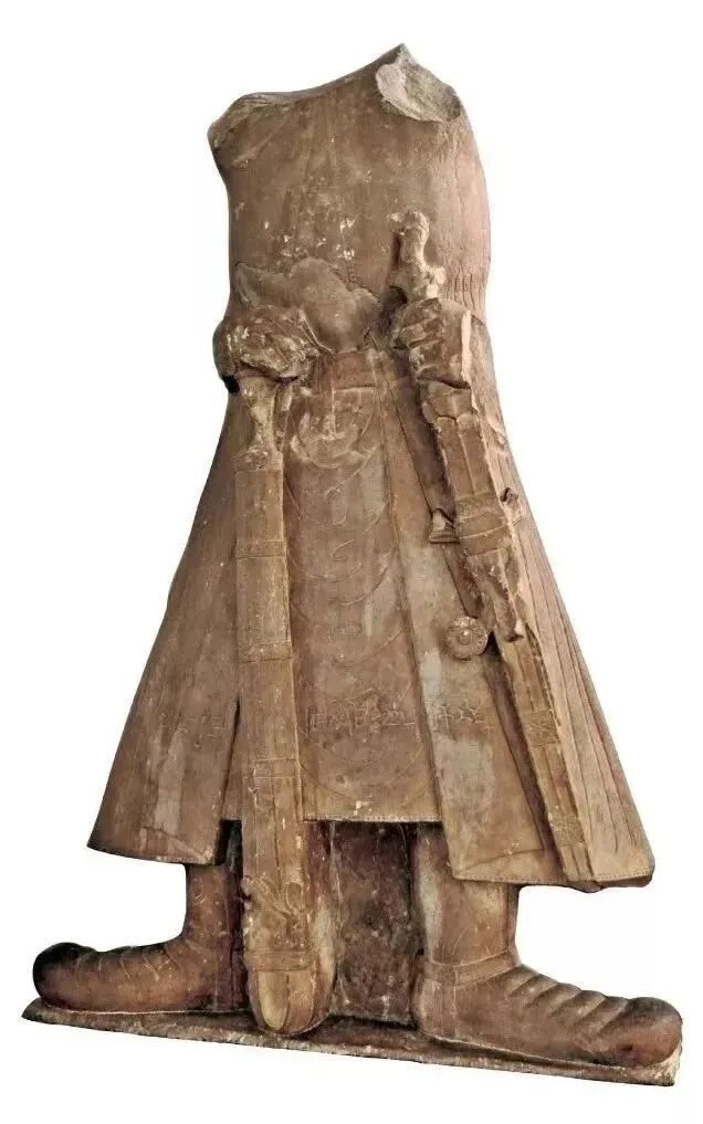 相传迦腻色迦王是在远征北方的途中,被部将暗杀。他的立像在马都拉附近的摩多出土,现收藏在马都拉博物馆。这尊雕像缺少头部,很难窥见迦腻色迦王的全貌。立像穿的是长长的上衣,刺绣的半筒靴,一手持剑,一手按鞘,双脚分开站立,显得威武十足的样子(图见文首)。