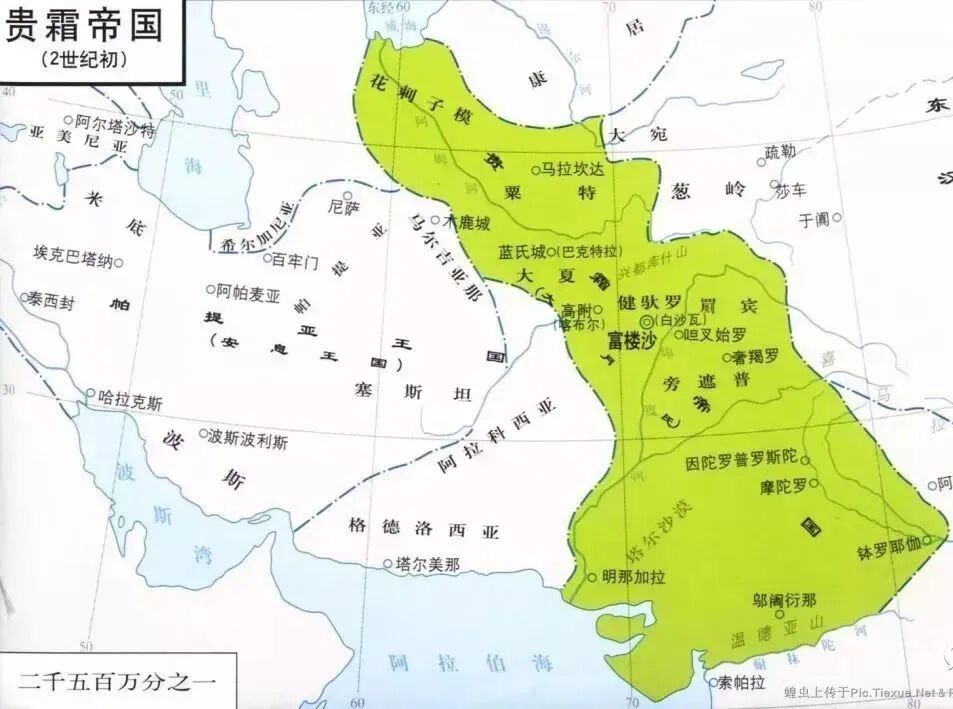 帝国的都城仍在中亚。到了迦腻色迦王时期,贵霜帝国进一步扩张,贵霜帝国的版图西起伊朗东境,东至恒河中游,北起锡尔河、葱岭,南至纳巴达河,迦腻色迦王又把都城迁到了印度键陀岁地区的白沙瓦,使这一地区成为帝国统治的中心。