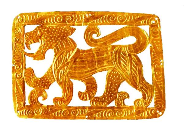 哈萨克斯坦的伊塞克古冢(公元前4世纪末至公元前3世纪初)出土了3000余件金饰品,其中的錾压平行纹、大角羊、抽象化鸟头的金箔片与马家塬墓地出土的同类器物有着惊人的相似之处。此外,伊塞克古冢还出土了后蹄翻转的动物纹金饰品,与巴泽雷克墓地的同类器物十分相似。另外,伊塞克古冢中出土的带翼大角羊形象,显然受到了阿契美尼德王朝有翼格雷芬形象的影响。