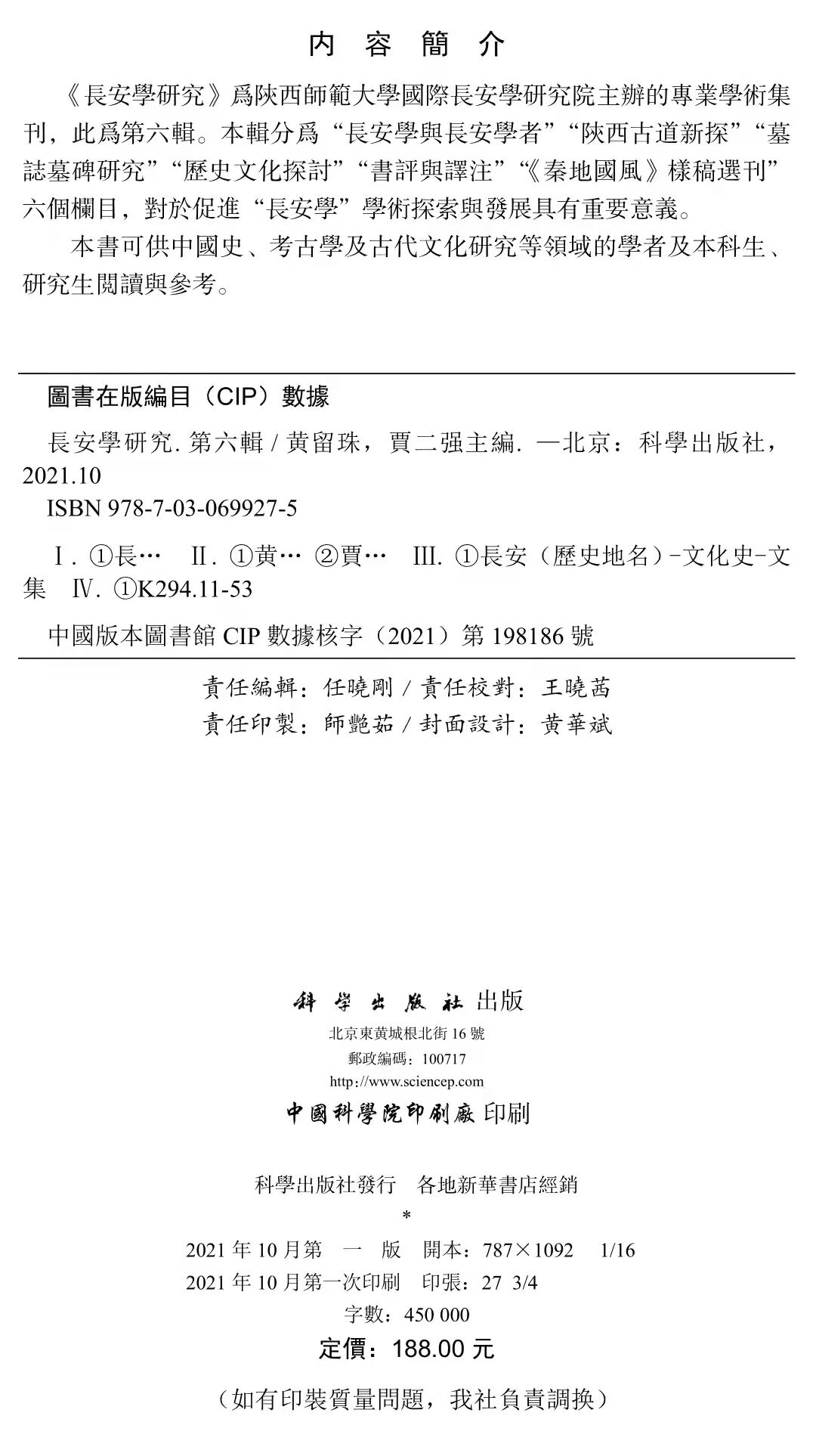 《長安學研究》爲陝西師範大學國際長安學研究院主辦的專業術集刊,此爲第六輯。本輯分爲“長安學與長安學者”“陝西古道新探”“墓誌墓碑研究”“歷史文化探討”“書評與譯注”“《秦地國風》樣稿選刊”六個欄目,對於促進“長安學”學術探索與發展具有重要意義。本書可供中國史、考古學及古代文化研究等领域的者及本科生研究生閱讀與參考。
