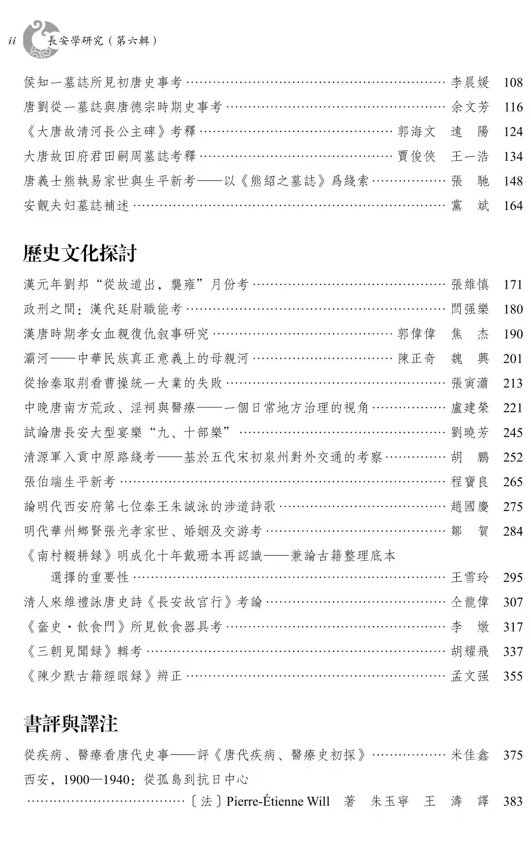 政刑之間:漢代廷尉能考…………閆强樂年008年年!漢唐时期孝女血親復仇叙事研究…………郭杰190灞河--中華民族真正意義上的母親河…陳正奇魏201張寅瀟 213中晚唐南方荒政、淫祠與醫療--一個日常地方治理的视角……盧建榮221