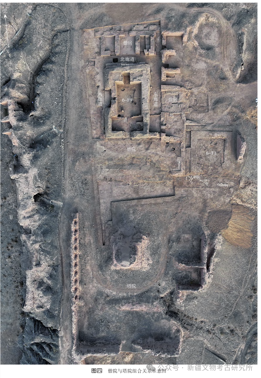 僧房以6号建筑群清理出的一组僧院遗迹为代表,这也是本次发掘最为重要的发现之一。僧院以6-F9为中心,顶残,南北向,平面呈长方形,南北墙中部均开门道,北墙中部门道后期封堵。其西、北、东三侧为贯通的大廊道,廊道外为成组僧房。北、东廊道及其连接的僧房建筑保存较好,部分僧房内发现床或炕。西廊道被破坏,仅存部分地面,其西侧的僧房不存。6-F9南、北墙中部各开一门道,其连线延长线与南侧佛塔中心基本处于同一轴线(图四)。