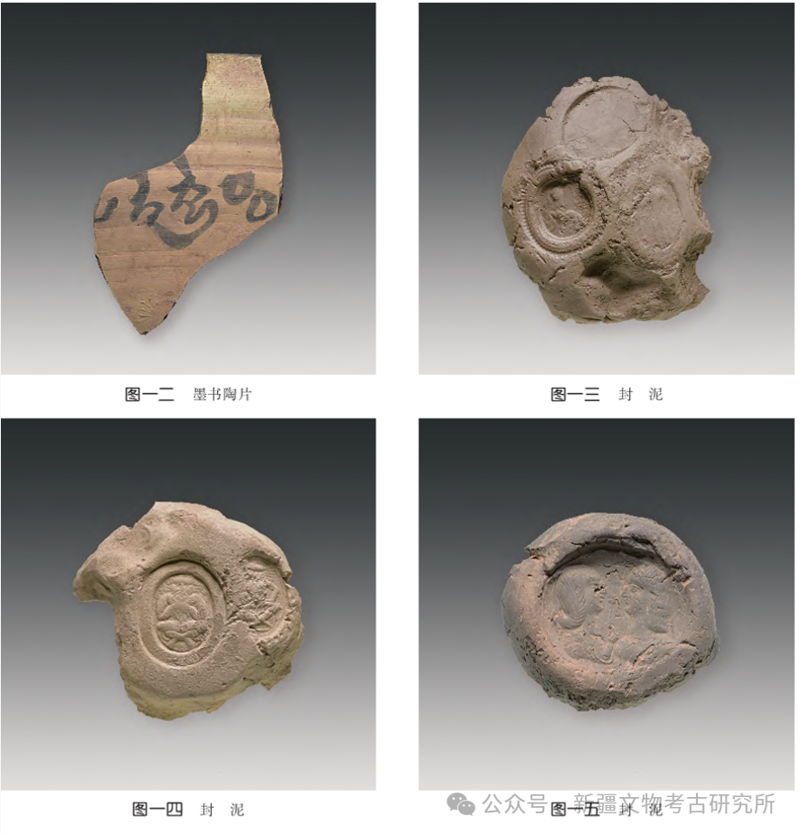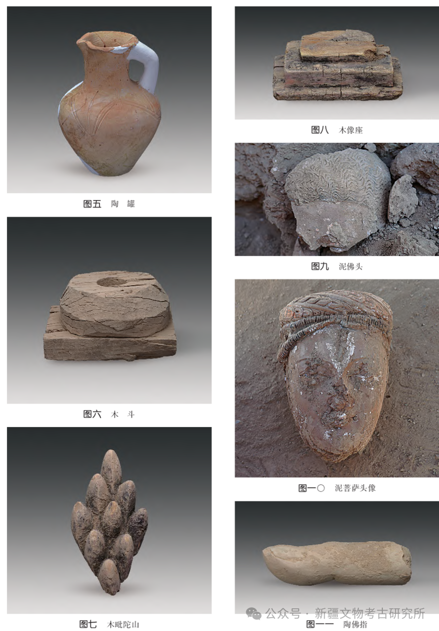 本次发掘出土陶、铜、木、铁、金、玻璃、石膏等各类遗物600余件(组)以陶灯、铜钱为主,另见陶罐(图五)、木斗(图六)、木毗陀山(图七)、木像座(图八)、泥佛头(图九)、泥菩萨头像(图一〇)、陶佛指(图一一)、墨书陶十(图一二)釉陶罐、铜铃、圆形和动物形铜饰片等。此外,遗址还出土了10余件压印有人物或动物形象的封泥,部分人物形象可能与西方古典神话人物相关(图一三~一五)。这些封泥生动诠释了东西方文化的交流与融合。综合遗亦现象、出土遗物和测年数据推断,佛寺主体使用年代为魏晋至隋唐时期,部分建筑营建年代可追溯至东汉时期,是新疆目前已发现的年代较早的佛教寺院之一。