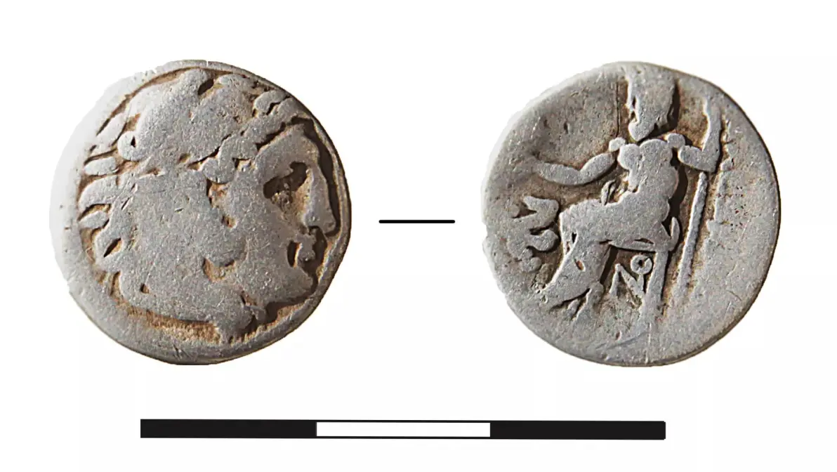 写有亚历山大大帝铭文的德拉克马(Lampsacus制造),银质。乌尊达拉。公元前 310–301 年 它是这里来自最远地区的钱币,其磨损程度表示了流通了很长时间。 e. 乌兹别克斯坦共和国科学院艺术史研究所,塔什干。