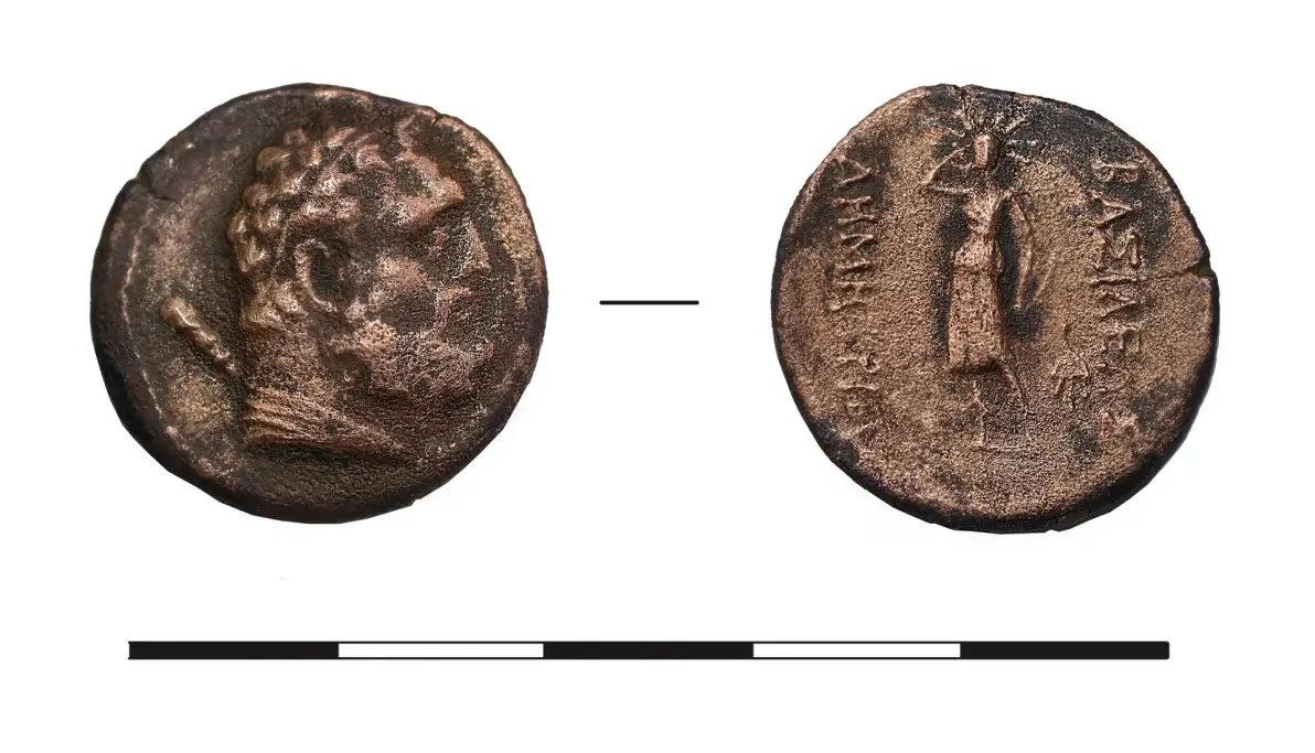 安条克一世的铜币 乌尊达拉 公元前281年–261年 头戴头盔的雅典娜 胜利女神 e. 乌兹别克斯坦共和国科学院艺术史研究所,塔什干。