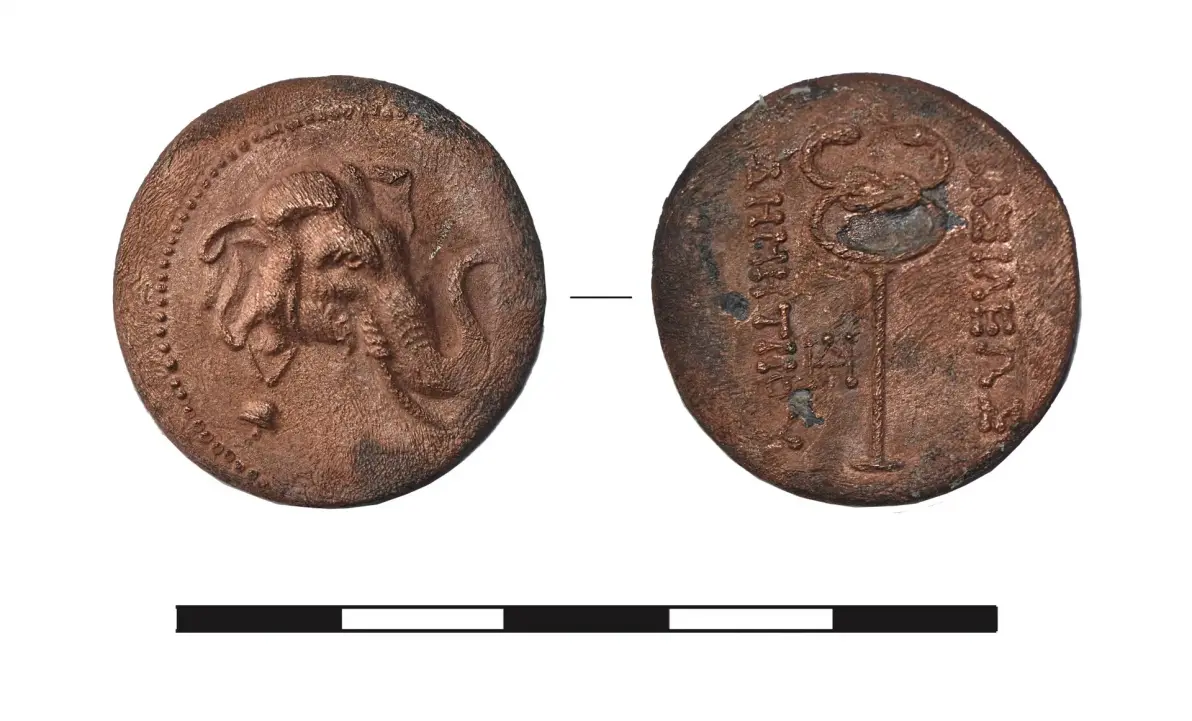 德米特里乌斯一世 查坷铜币 乌尊达拉 挂着铃铛的大象 双蛇杖 公元前 200–185 年 e. 乌兹别克斯坦共和国科学院艺术史研究所,塔什干。