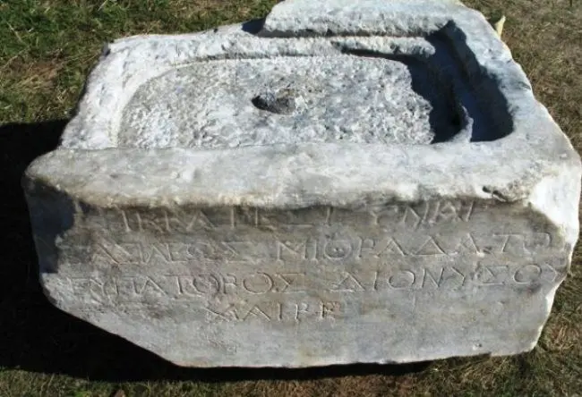 墓石座上刻着密特拉达斯·欧帕托的妻子Hypsikratia的墓志铭: