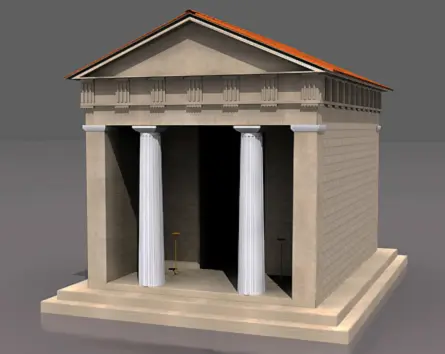神庙复原图-该建筑被推测是一座“安蒂斯神庙”,即希腊神庙的古代变体,被认为是小亚细亚和埃及岩石墓穴的正面原型。发现这座寺庙,就像直接建在它上面的那座寺庙一样,由一个中央房间(称为“naos”)和入口门廊和 naos(pronaos)之间的一个小型半开放区域组成。总建筑面积约14.5平方米。与许多其他此类古建筑一样,我们发现这座寺庙是用泥砖建造的,没有地基。根据科学家的说法,奇怪的是,很可能用于祭祀的祭坛壁炉位于内殿内部,而不是在寺庙外面,