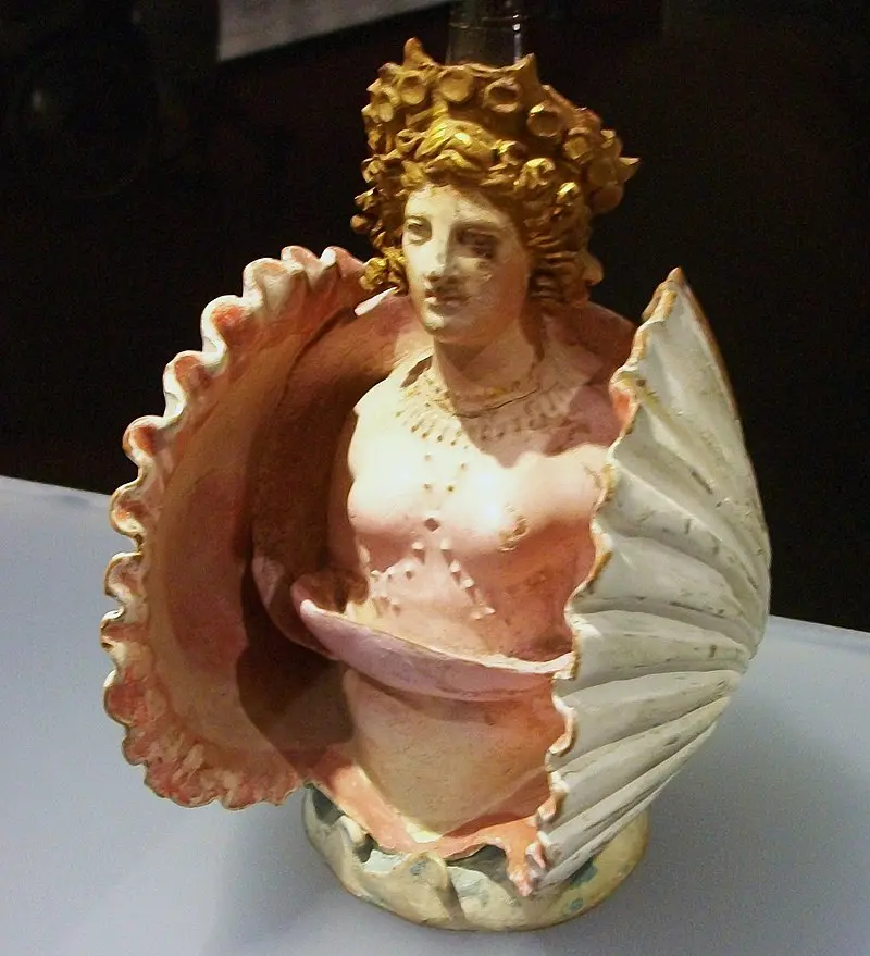 贝壳内阿芙罗狄蒂形状的彩绘陶器;古希腊阿提卡风格,发现于法纳戈里亚墓地中,公元前 4 世纪 1 季度。收藏于圣彼得堡艾尔米塔什博物馆。