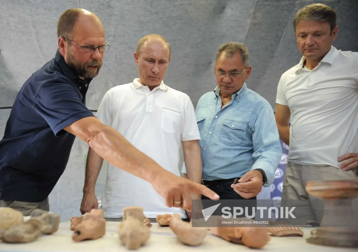 2011 年 8 月 10 日,俄罗斯总理弗拉基米尔·普京(左二)在参观对塔曼半岛古希腊城市法纳戈里亚进行发掘的考古学家营地时观看考古发现。左:历史学博士弗拉基米尔·库兹涅佐夫。右起:克拉斯诺达尔地区州长亚历山大·特卡乔夫和谢 尔 盖·绍 伊 古。