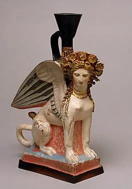 狮身人面像形状的陶器,公元前 5 世纪。在法纳戈里亚附近的女性墓地(“德墨忒尔的女祭司”)中发现的 26 件类似作品之一。在圣彼得堡冬宫博物馆展出。