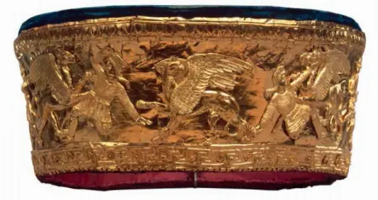 这件黄金头冠是在博尔沙亚布利兹尼察墓葬群的挖掘过程中发现的,该墓葬是古希腊城市法纳戈里亚的一个墓葬群。法纳戈里亚被认为是直接影响斯基泰人金器艺术的城邦,这种艺术风格随着草原向东方扩散。约公元前4世纪